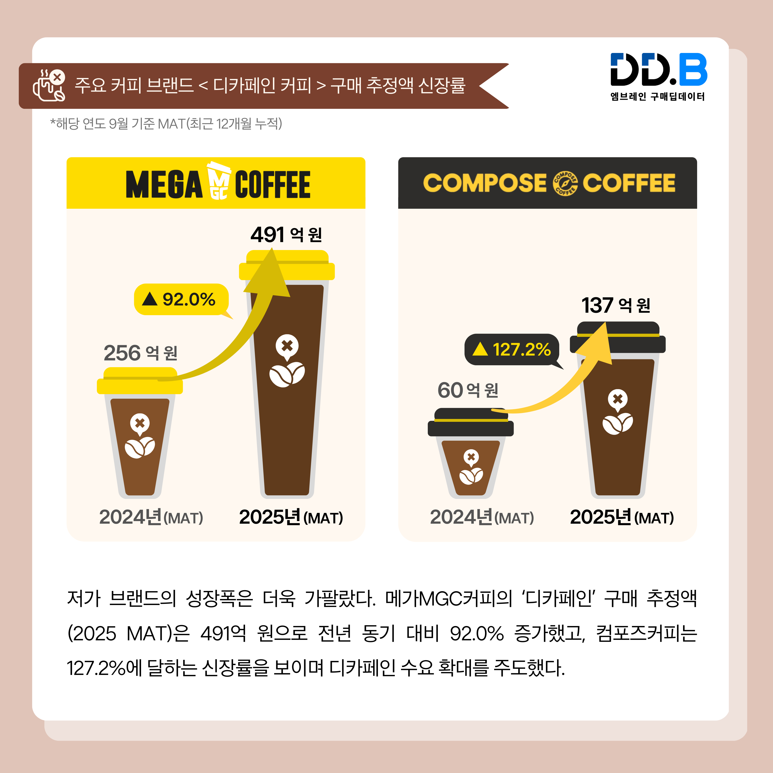 특히, 프리미엄 커피 브랜드를 중심으로 디카페인 시장이 빠르게 성장하고 있는 점이 눈에 띈다. 스타벅스 ‘디카페인’ 음료의 연간 구매 추정액(2025 MAT)은 1,566억 원으로, 전년 대비 52.8% 증가했으며, 투썸플레이스는 48.4%의 성장세를 기록한 것으로 확인됐다. 저가 브랜드의 성장폭은 더욱 가팔랐다. 메가MGC커피의 ‘디카페인’ 구매 추정액(2025 MAT)은 491억 원으로 전년 동기 대비 92.0% 증가했고, 컴포즈커피는 127.2%에 달하는 신장률을 보이며 디카페인 수요 확대를 주도했다. 대체로 디카페인 커피 구매 시 추가 금액을 지불해야 한다는 점을 고려하면, 가격 부담이 적은 저가 브랜드가 디카페인 음료 선택에 유리하게 작용했을 것으로 보인다.