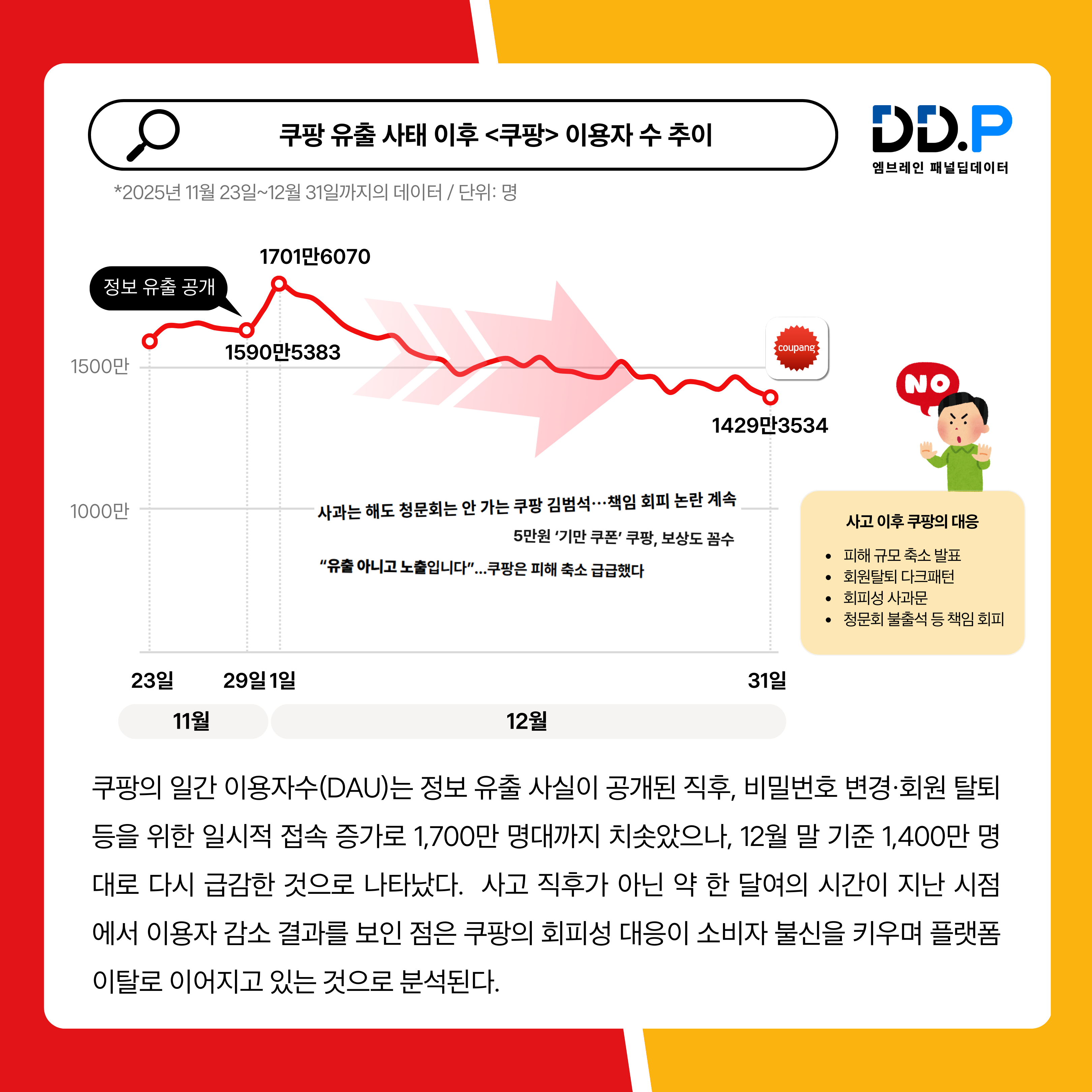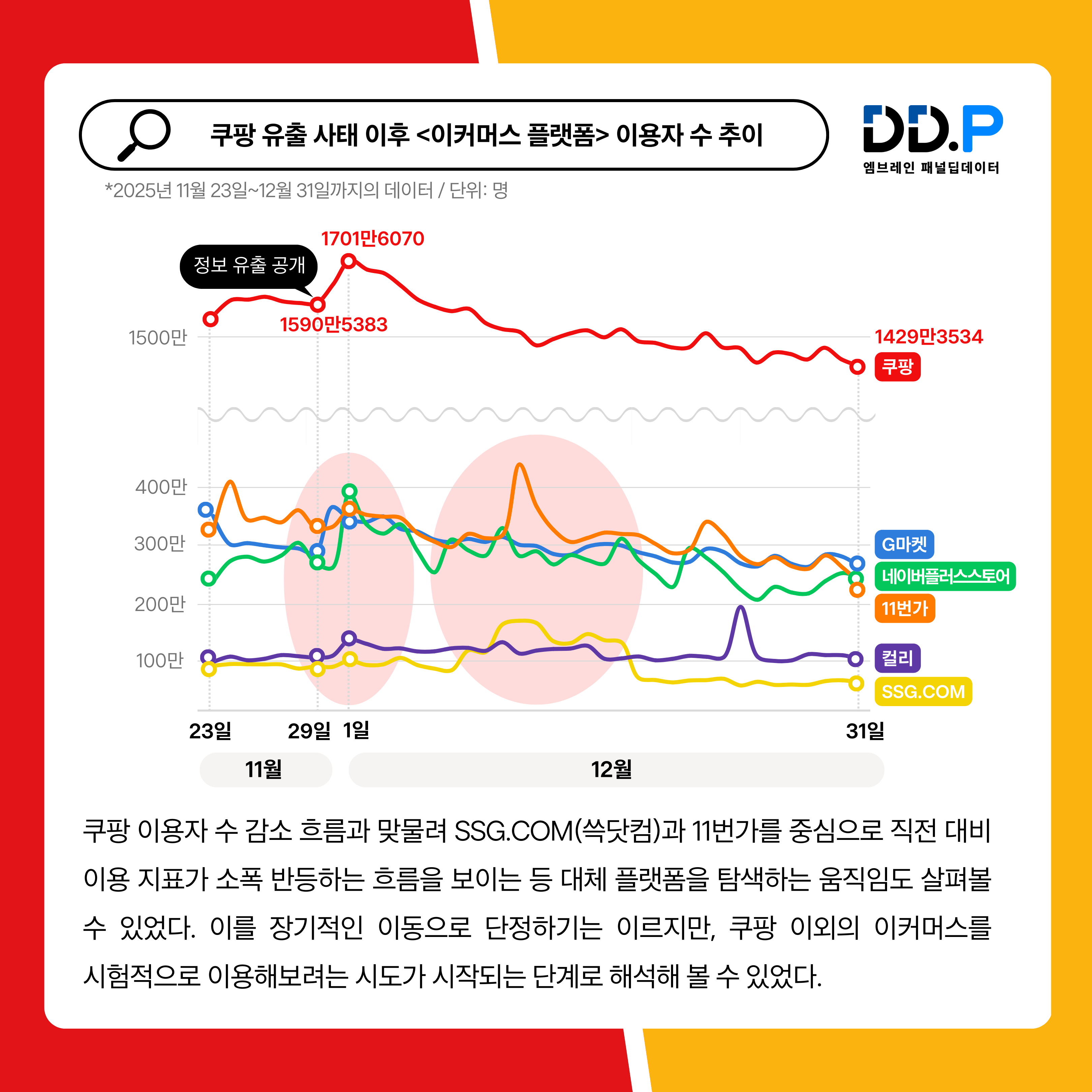 → 엠브레인 딥데이터®[1]의 이커머스 앱(App) 트렌드 분석에 따르면, 쿠팡의 대규모 개인정보 유출 사태 이후 국내 이커머스 시장에 미묘한 변화가 감지되고 있다. 우선, 쿠팡의 일간 이용자수(DAU)는 정보 유출 사실이 공개된 11월 29일 직후, 연속 증가세를 보이다 일시적으로 1,700만 명대까지 치솟은 결과를 확인할 수 있었다. 이는 쿠팡의 정보유출 사태 파악과 비밀번호 변경, 회원 탈퇴를 위해 접속한 ‘확인형 접속’으로 풀이된다. 문제는 그 이후다. 12월 말 기준 이용자 수가 1,400만 명대까지 급감한 것으로, 정보유출 사고 ‘바로 직후’가 아닌 약 한달여의 시간이 지난 시점에서 이용자 감소 결과를 보인 점이 주목할 만하다.