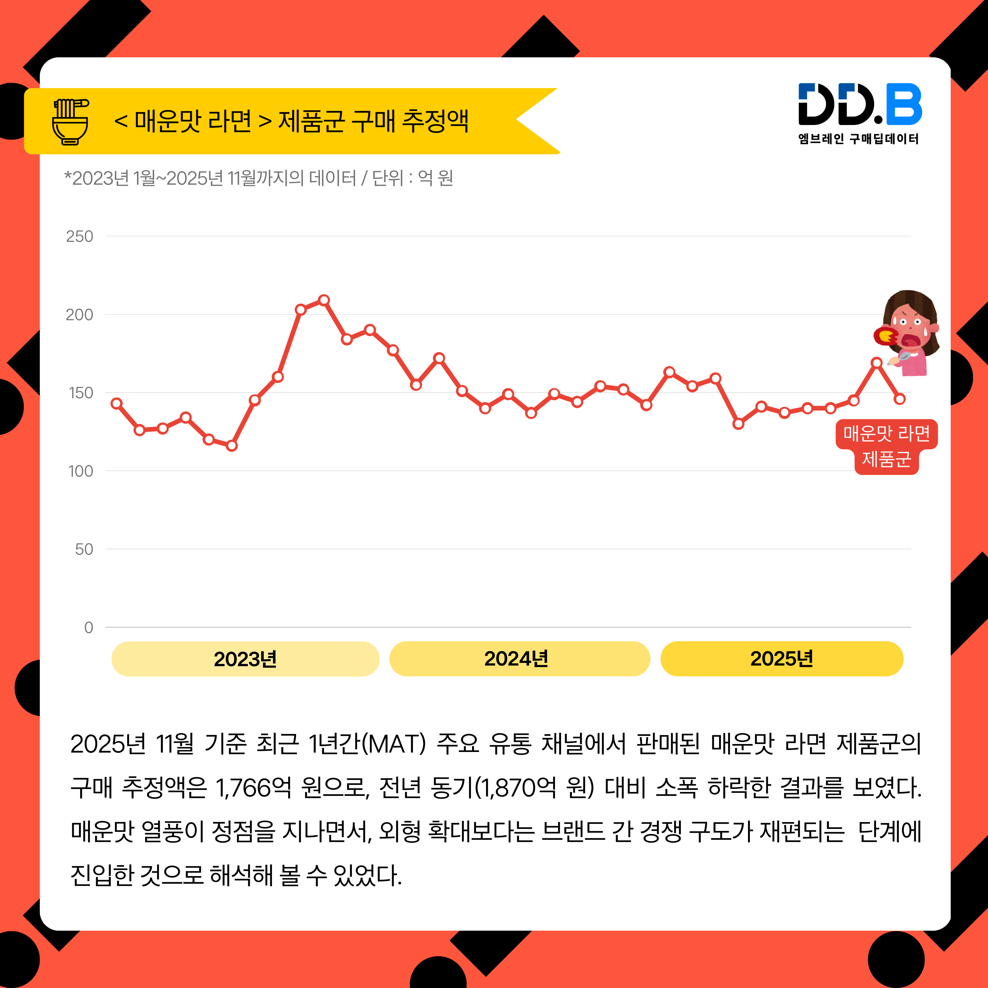 → 엠브레인 딥데이터®[1]의 구매 트렌드 분석에 따르면, ‘극한의 매운맛’ 경쟁으로 빠르게 성장해 온 매운 라면 시장이 최근 들어 조정 국면에 접어든 것으로 확인됐다[2]. 2025년 11월 기준 최근 1년간(MAT) 주요 유통 채널에서 판매된 매운맛 라면 제품군의 구매 추정액은 1,766억 원으로, 전년 동기(1,870억 원) 대비 소폭 하락한 결과를 보였다. 매운맛 열풍이 정점을 지나면서, 외형 확대보다는 브랜드 간 경쟁 구도가 재편되는 단계에 진입한 것으로 해석해 볼 수 있었다.