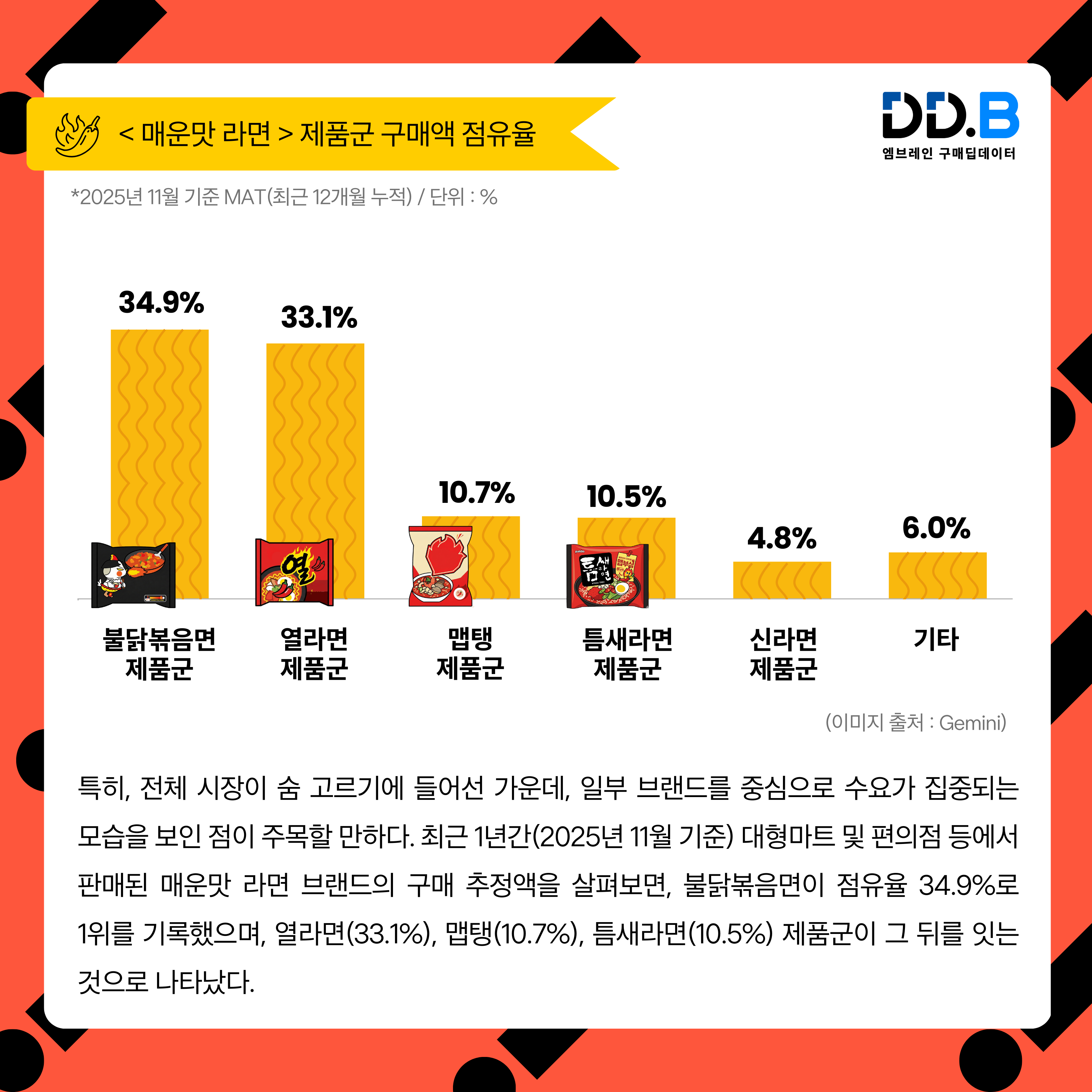 특히, 전체 시장이 숨 고르기에 들어선 가운데, 일부 브랜드를 중심으로 수요가 집중되는 모습을 보인 점이 주목할 만하다. 최근 1년간(2025년 11월 기준) 대형마트 및 편의점 등에서 판매된 매운맛 라면 브랜드의 구매 추정액을 살펴보면, 불닭볶음면이 점유율 34.9%로 1위를 기록했으며, 열라면(33.1%), 맵탱(10.7%), 틈새라면(10.5%) 제품군이 그 뒤를 잇는 것으로 나타났다. 이는 매운맛 라면 시장이 다수 제품이 경쟁하던 단계를 지나, 상위 브랜드 중심의 구조로 재편되고 있음을 보여주는 결과로 풀이된다.