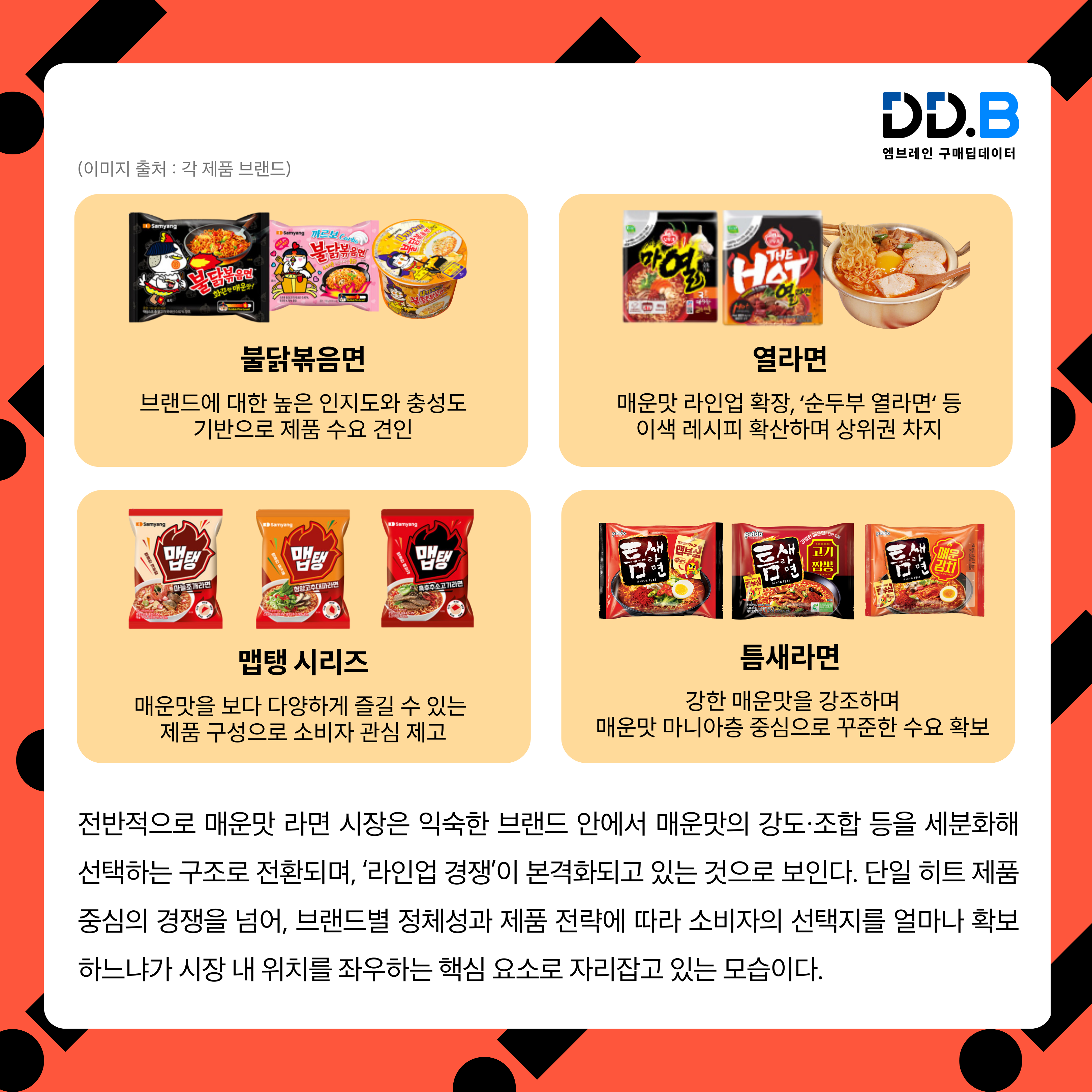 전반적으로 매운맛 라면 시장은 익숙한 브랜드 안에서 매운맛의 강도·조합 등을 세분화해 선택하는 구조로 전환되며, ‘라인업 경쟁’이 본격화되고 있는 것으로 보인다. 단일 히트 제품 중심의 경쟁을 넘어, 브랜드별 정체성과 제품 전략에 따라 소비자의 선택지를 얼마나 확보하느냐가 시장 내 위치를 좌우하는 핵심 요소로 자리잡고 있는 모습이다. 매운맛 라면 시장이 소수 강자 중심의 구도로 재편되고 있는 가운데, 향후 브랜드 간 경쟁 구도가 어떻게 전개될지 관심이 모아지고 있다.