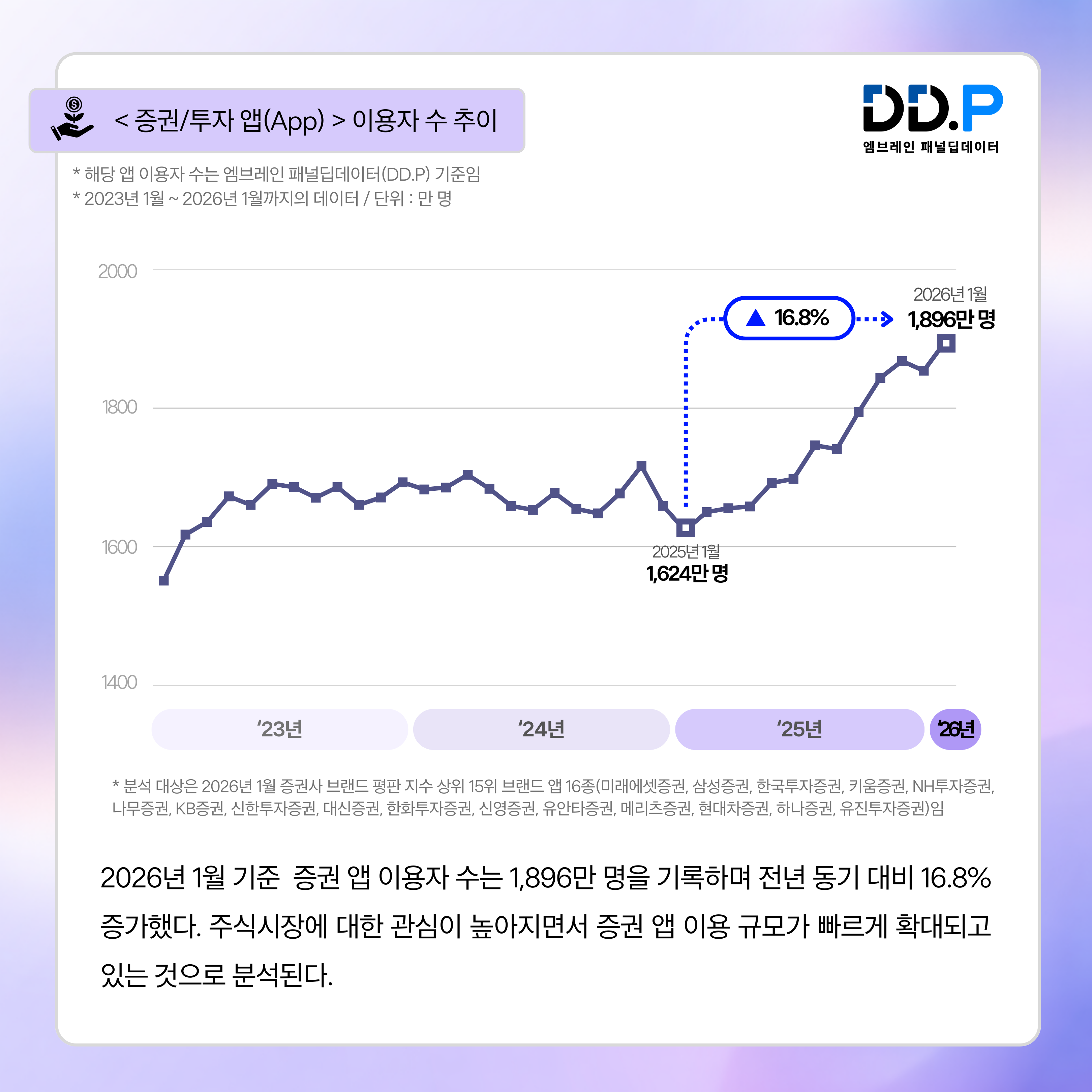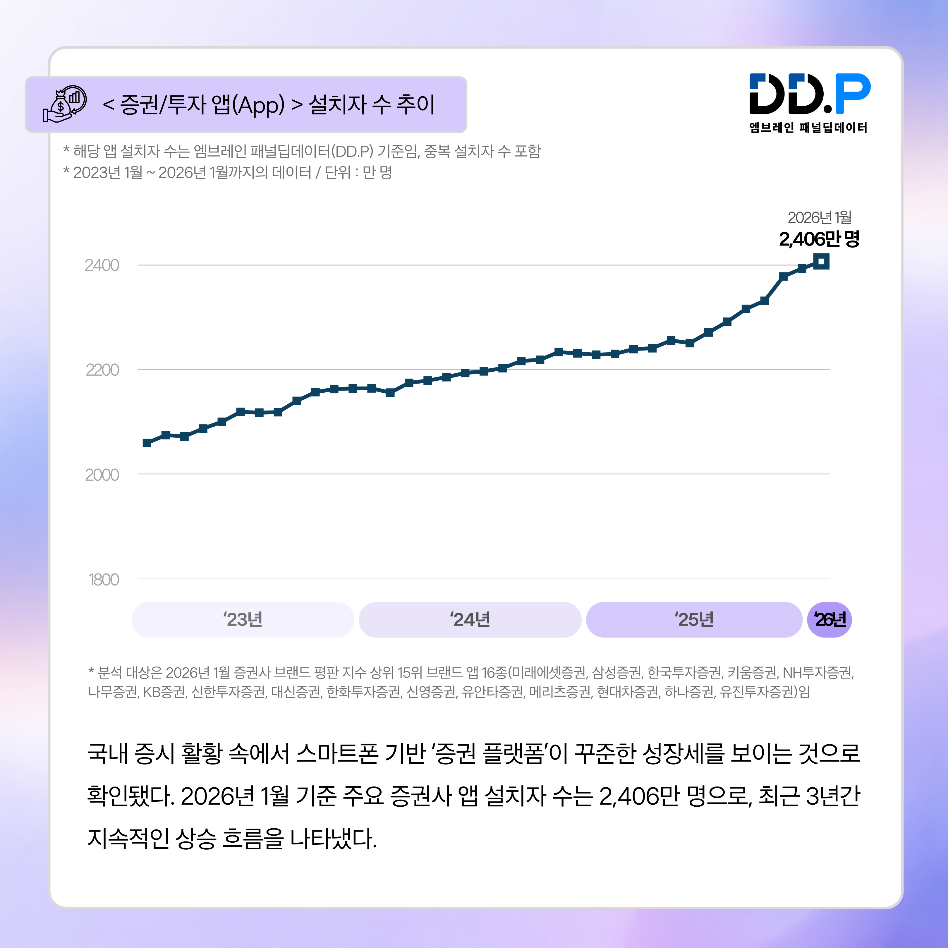 → 엠브레인 딥데이터®[1]의 ‘증권사 앱(App)’ 분석 결과, 국내 증시 활황 속에서 스마트폰 기반 ‘증권 플랫폼’이 꾸준한 성장세를 보이는 것으로 확인됐다. 2026년 1월 기준 주요 증권사 앱 설치자 수[2]는 2,406만 명으로, 최근 3년간 지속적인 상승 흐름을 나타냈다(그래프 참조). 같은 기간 증권 앱 이용자 수[3]는 1,896만 명을 기록하며 전년 동기 대비 16.8% 증가했다. 주식시장에 대한 관심이 높아지면서 증권 앱 이용 규모가 빠르게 확대되고 있는 것으로 분석된다.