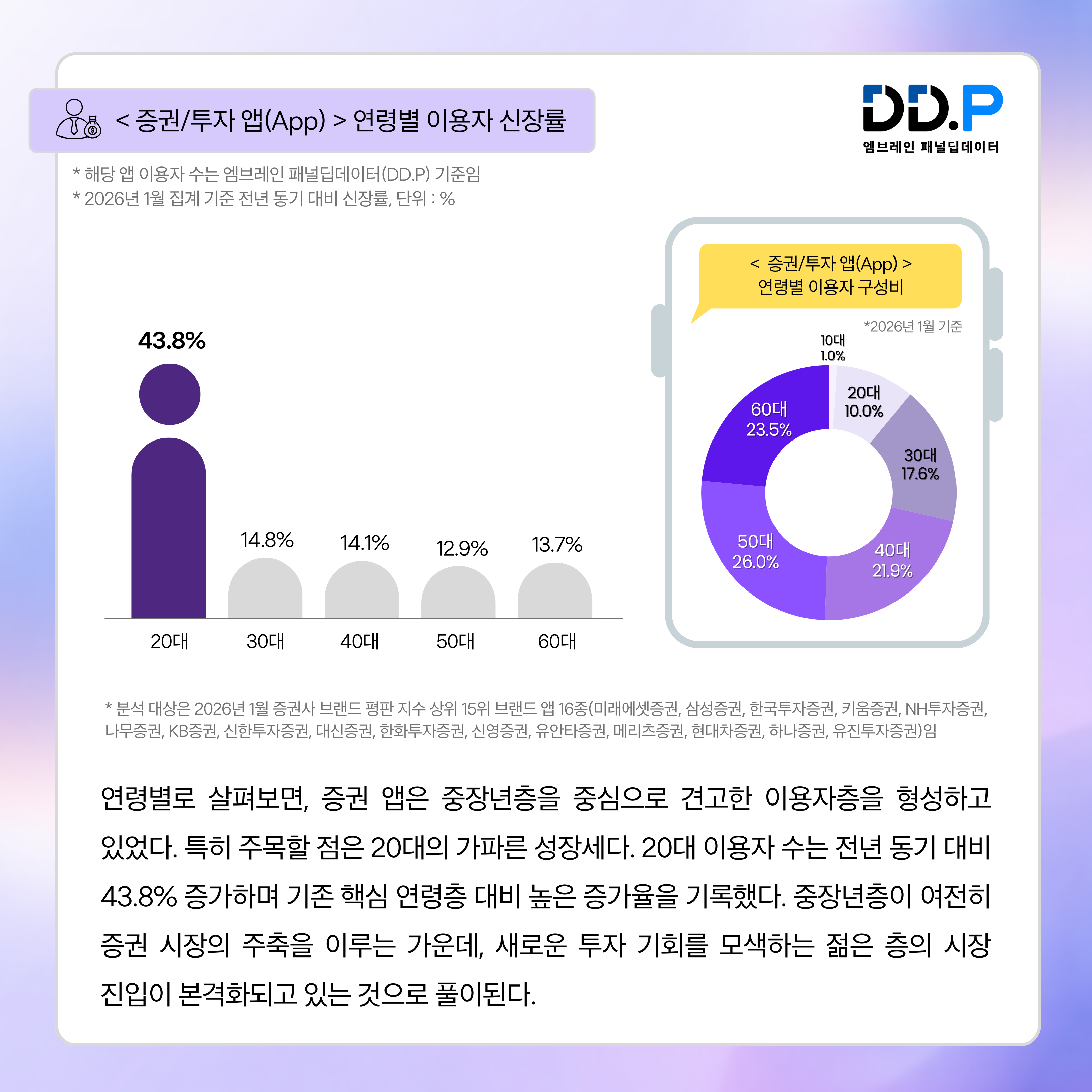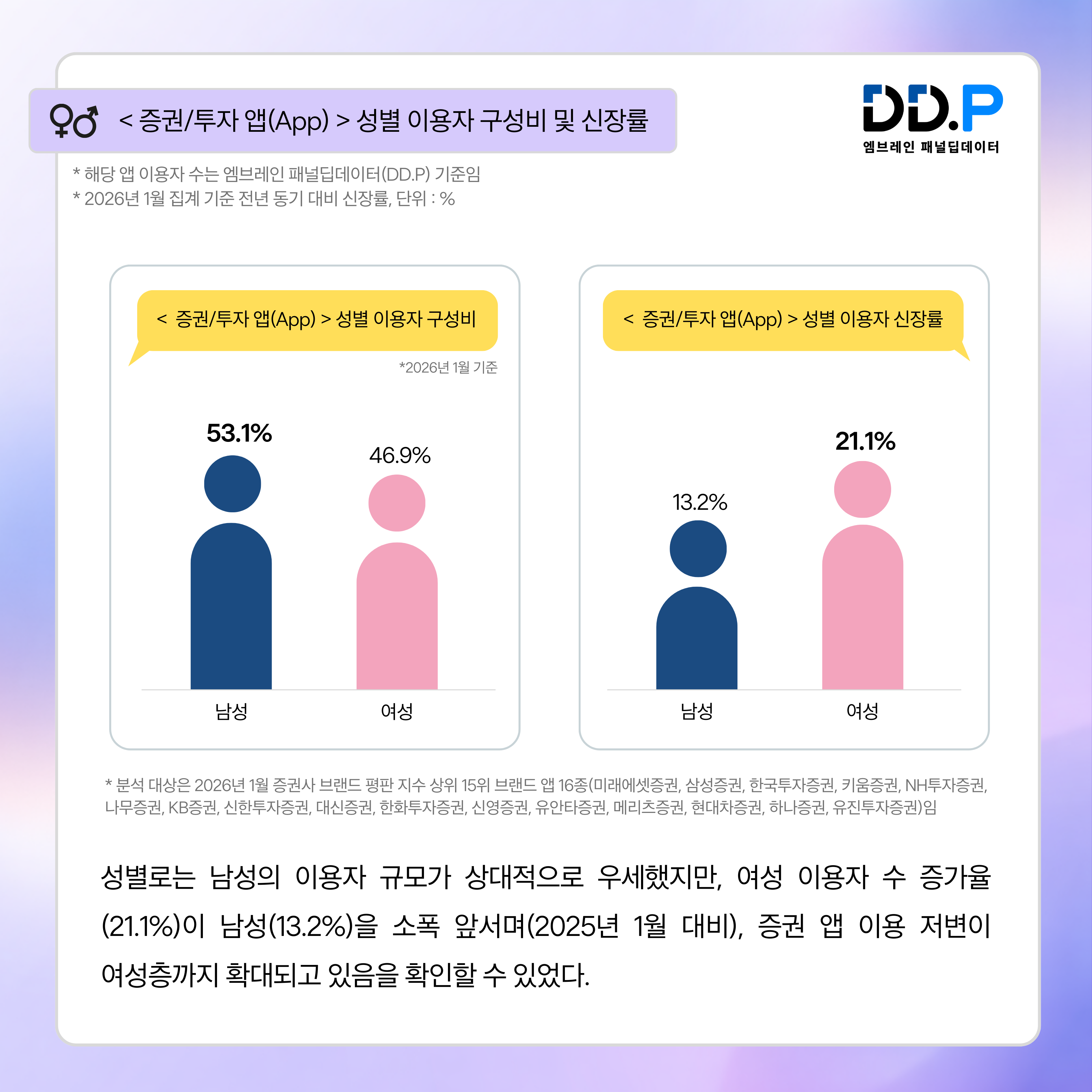 연령별로 살펴보면, 증권 앱은 중장년층을 중심으로 견고한 이용자층을 형성하고 있었다(10대 1.0%, 20대 10.0%, 30대 17.6%, 40대 21.9%, 50대 26.0%, 60대 23.5%). 특히 주목할 점은 20대의 가파른 성장세다. 20대 이용자 수는 전년 동기 대비 43.8% 증가하며 기존 핵심 연령층 대비 높은 증가율을 기록했다. 중장년층이 여전히 증권 시장의 주축을 이루는 가운데, 새로운 투자 기회를 모색하는 젊은 층의 시장 진입이 본격화되고 있는 것으로 풀이된다. 다만 절대적인 이용 규모는 아직 제한적인 수준으로, 향후 이들의 지속적인 이용 확대 여부를 지켜볼 필요가 있다. 성별로는 남성의 이용자 규모가 상대적으로 우세했지만, 여성 이용자 수 증가율(21.1%)이 남성(13.2%)을 소폭 앞서며(2025년 1월 대비), 증권 앱 이용 저변이 여성층까지 확대되고 있음을 확인할 수 있었다.