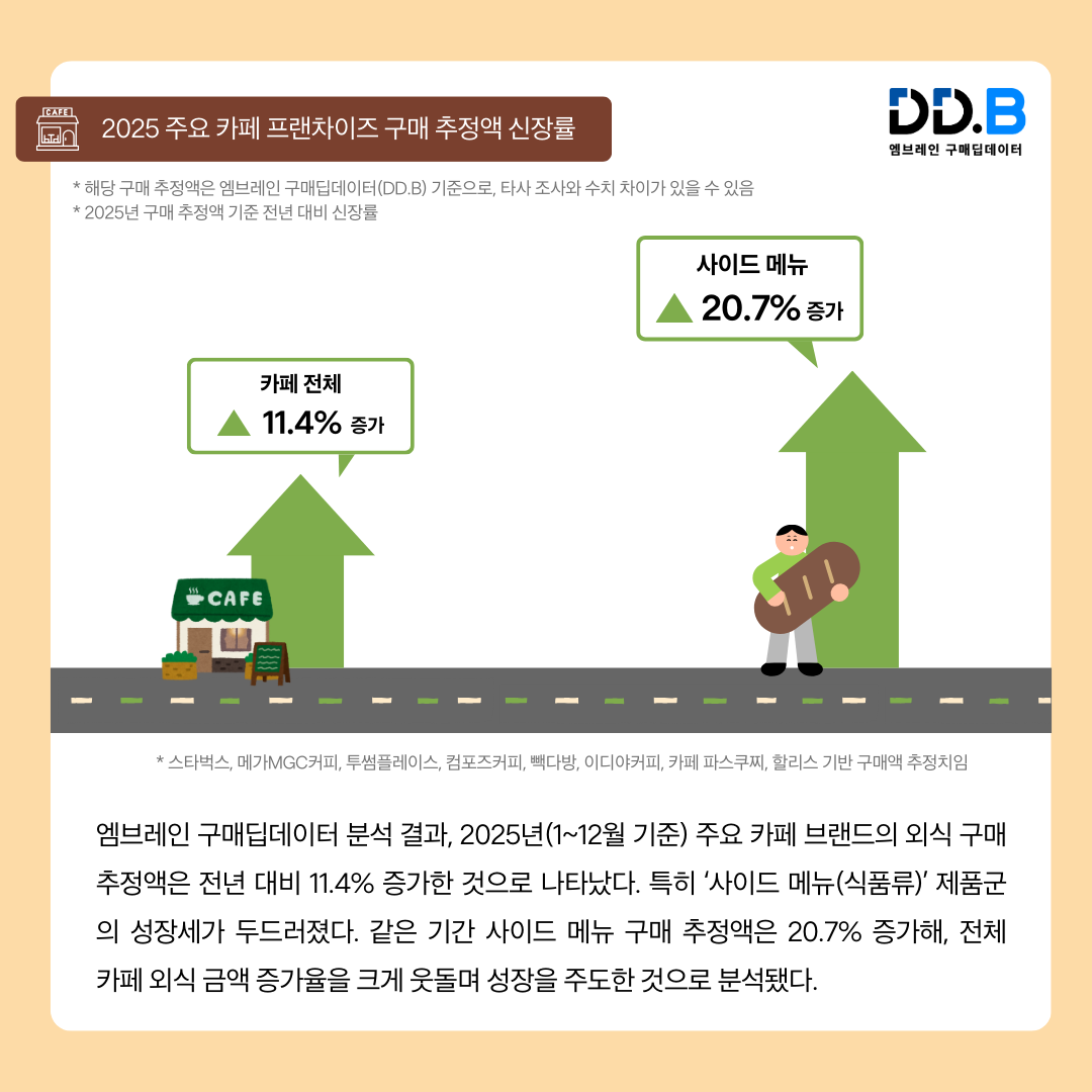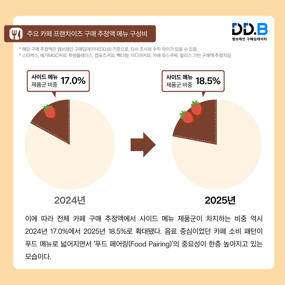 → 엠브레인 구매딥데이터[1] 분석 결과, 2025년(1~12월 기준) 주요 카페 브랜드의 외식 구매 추정액[2]은 전년 대비 11.4% 증가한 것으로 나타났다. 특히 ‘사이드 메뉴(식품류)’ 제품군[3]의 성장세가 두드러졌다. 같은 기간 사이드 메뉴 구매 추정액은 20.7% 증가해 전체 카페 외식 금액 증가율을 크게 웃돌며 성장을 주도했다. 이에 따라 전체 카페 구매 추정액 중 사이드 메뉴 제품군이 차지하는 비중도 2024년 17.0%에서 2025년 18.5%로 확대됐다. 음료 중심이었던 카페 소비 패턴이 푸드 메뉴로 넓어지면서, ‘푸드 페어링(Food Pairing)’의 중요성이 한층 높아지고 있는 모습이다.