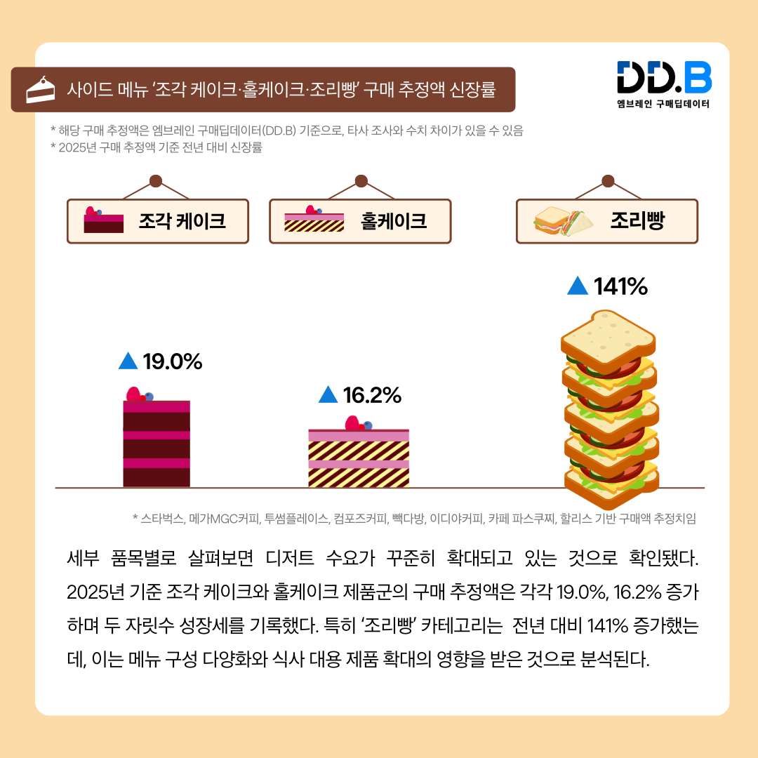 세부 품목별로 살펴보면 디저트 수요가 꾸준히 확대되고 있다. 2025년 기준 조각 케이크와 홀케이크 제품군의 구매 추정액은 각각 19.0%, 16.2% 증가하며 두 자릿수 성장세를 기록했다. 특히 ‘조리빵’ 카테고리는 전년 대비 141% 증가했는데, 이는 메뉴 구성 다양화와 식사 대용 제품 확대의 영향을 받은 것으로 분석된다.